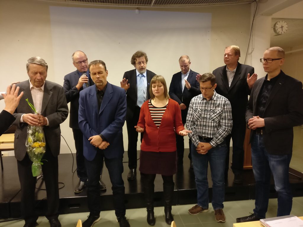 Suomen Vapaakirkon hallitus ja johtoryhmä siunasi sekä hallitustyöskentelyn jättävän Jukka Karppisen että hallitukseen valitut jäsenet.